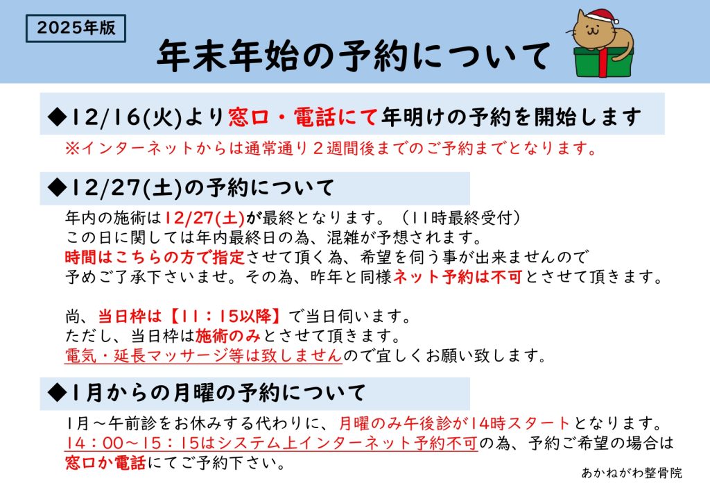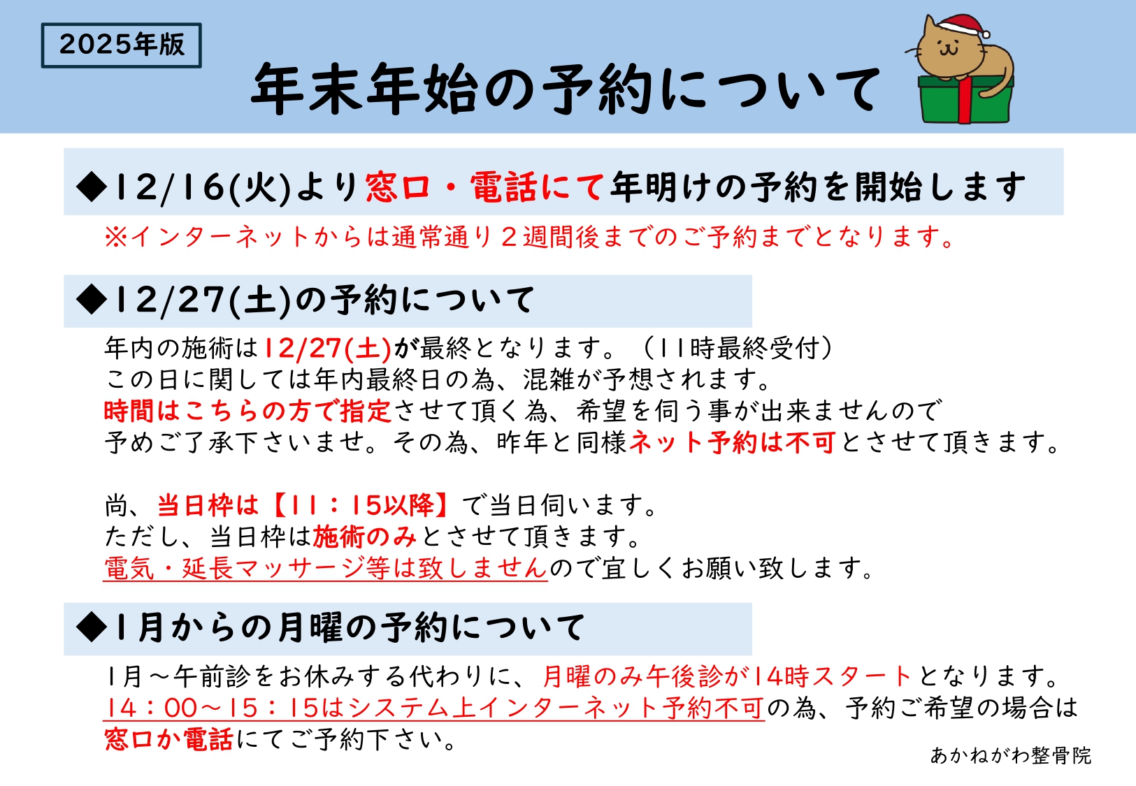 年末年始の予約について ツイート 12月16日(火)より年明け1月5日(月)以降の予約を順次開始致します。通常は2週間後を設定しておりますが、年末年始のお休みを考慮し、特例措置として3週間後までを予約可能にしております。 3週間後の予約が可能な期間は12月27日(土)まで。院内窓口またはお電話で可能です。 尚、インターネットからの予約は通常通り2週間後までの予約となりますのでご注意くださいませ。 12月27日(土)は年内最終日となります。予約方法が特殊になりますので上記を参考にご予約をお取りくださいませ。