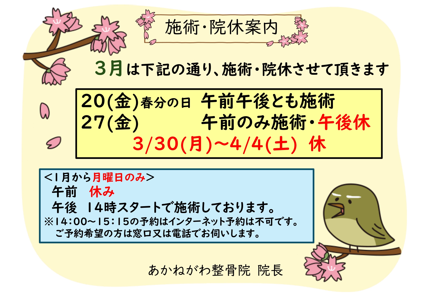 2026年 3月施術案内 ツイート ★3/20(金)春分の日は休まずに施術致します(午後も施術します!) ★3/27(金)は都合により午前のみの施術とし、午後は休ませて頂きます。 3/30(月)~4/4(土)まで1週間休ませて頂きます。