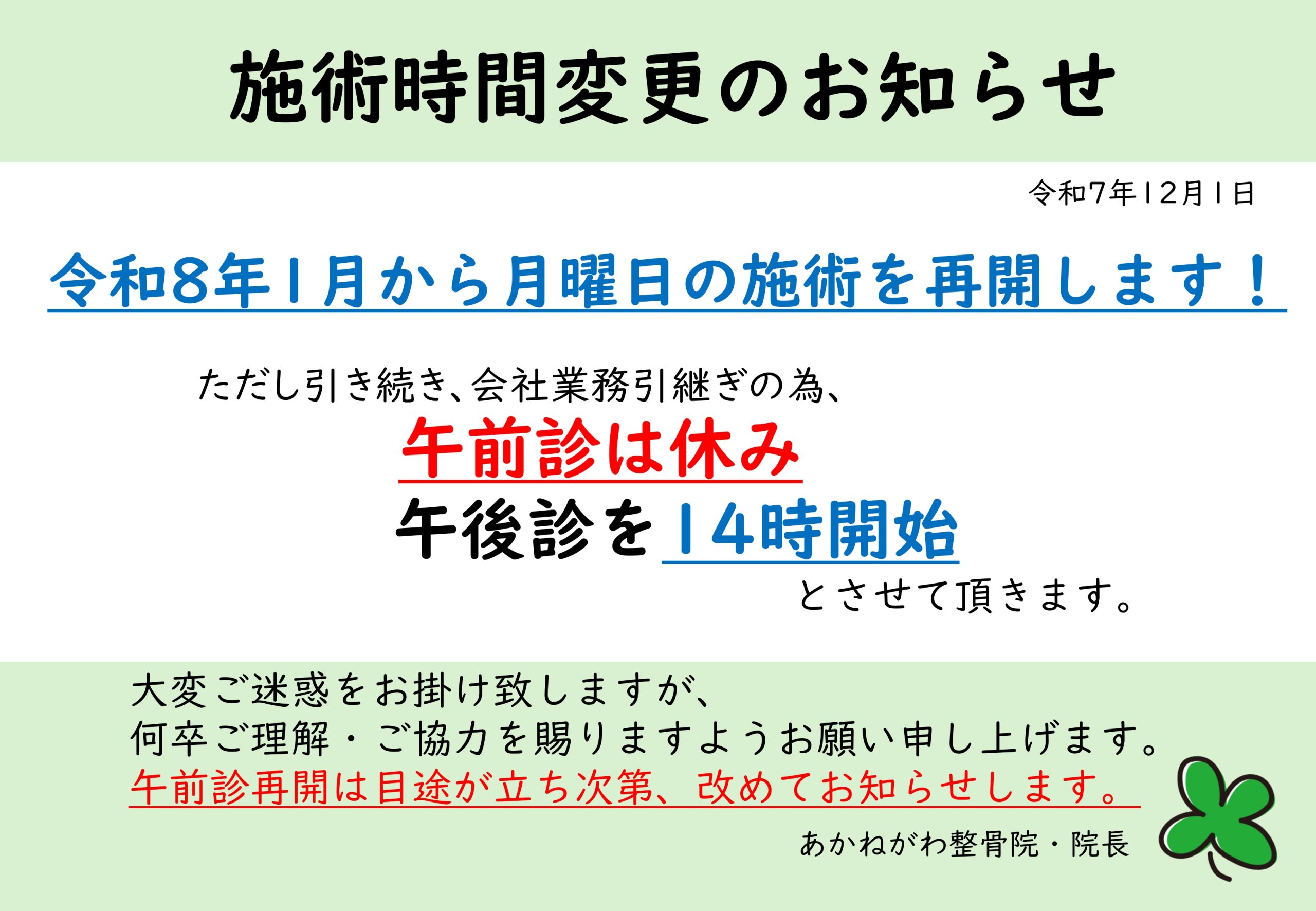この度2026年(令和8年)1月より、月曜日の施術を再開させて頂く運びとなりました。