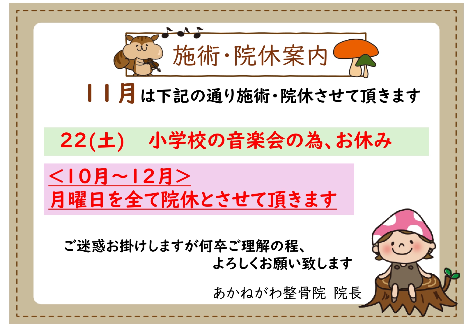 令和7年10月~12月の間、月曜日を全て院休とさせて頂く事になりました。